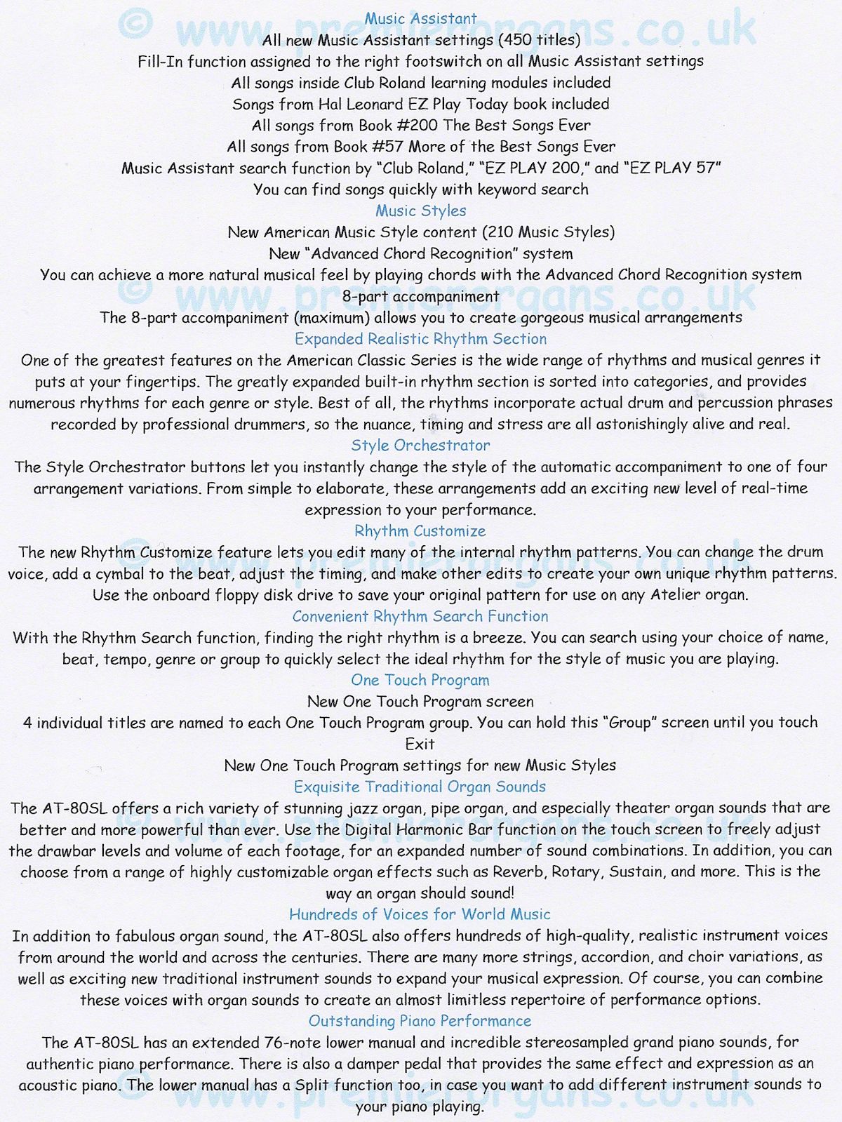 Roland AT80SL AT-80SL AT 80SL AT80 AT80S Atelier. Worlds finest organ sounds. Incredible performance. High quality sounds. Music styles from around the world. Easy play features. Touch screen. Pipe organ theatre organ jazz organ.