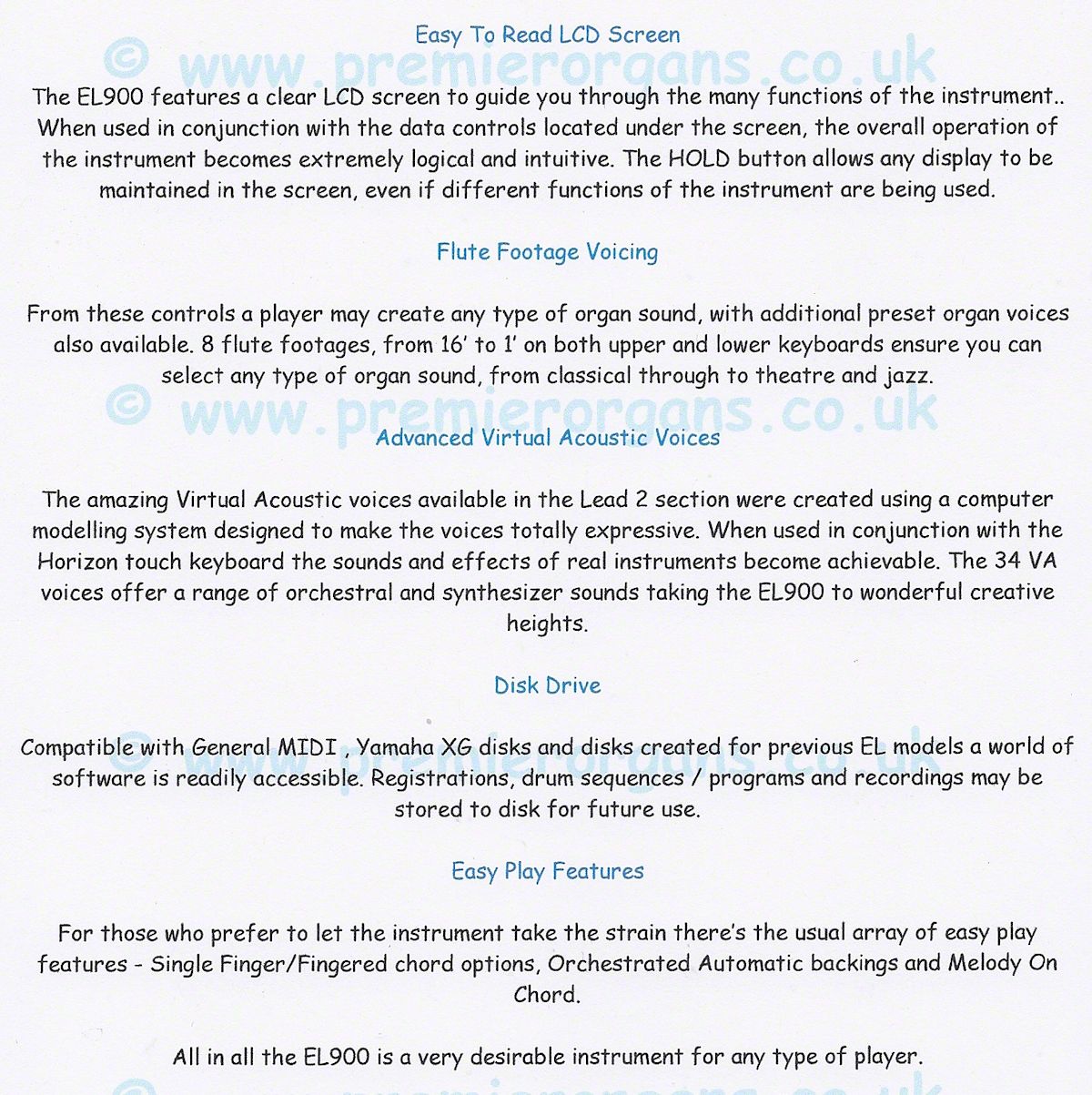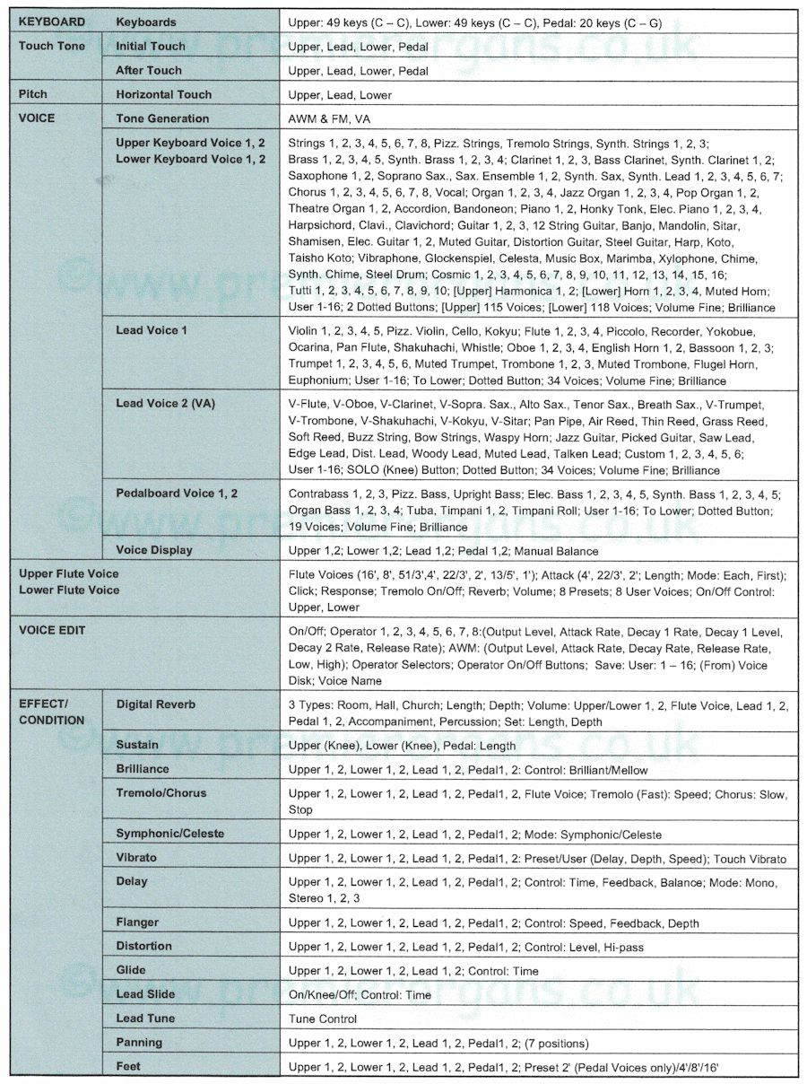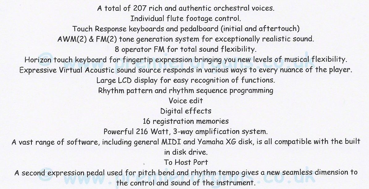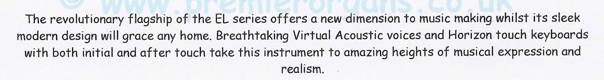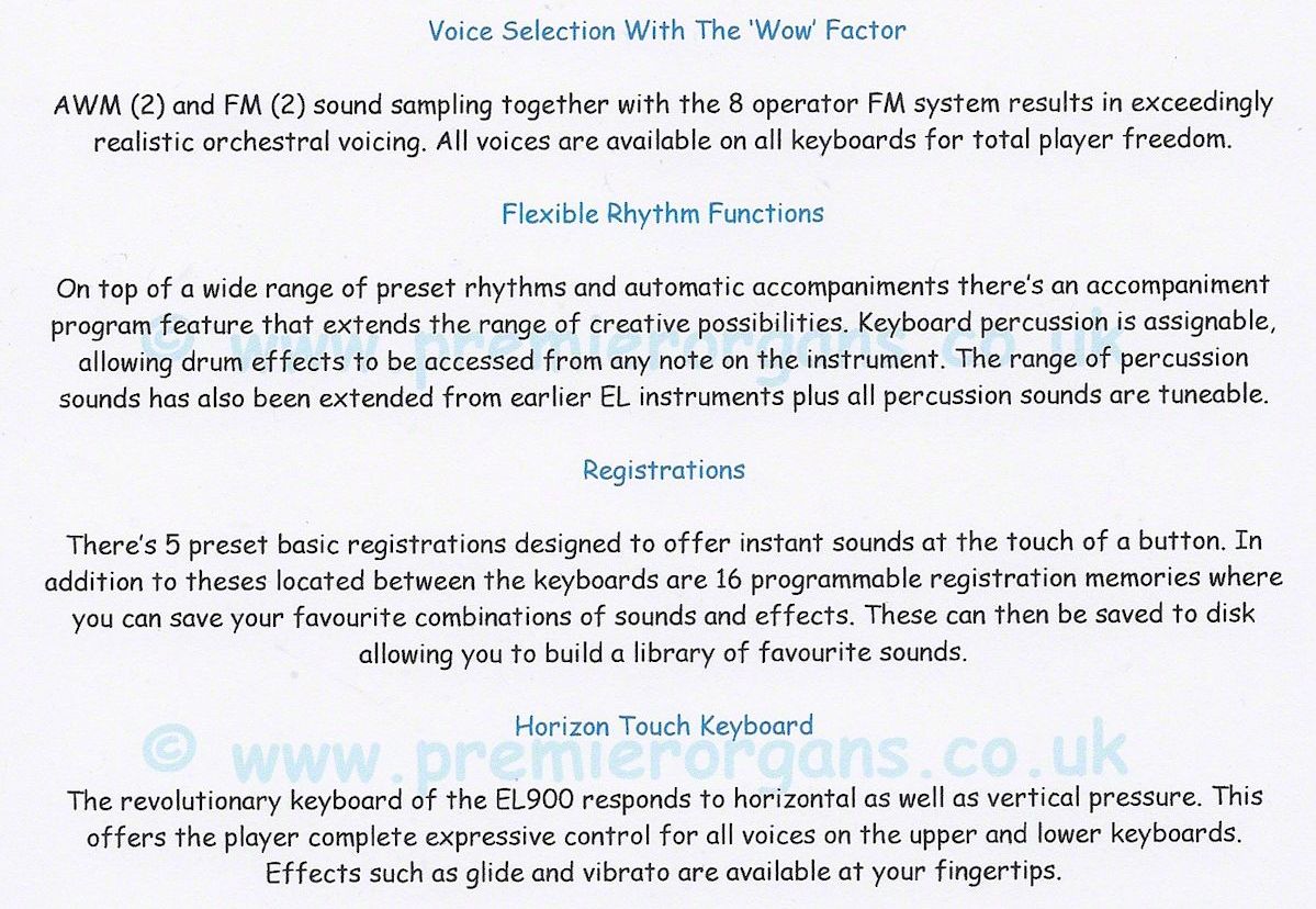 EL 900 is a professional quality instrument, challenging to play but in the right hands , wow...... what sounds it can produce. It features 'Horizon Touch' were moving the key sideways can add glide or vibrato effects. So now you have to remember what note to hit, how hard to hit it, how hard to press it after you hit it and which direction to press it to change the up or down glide or add vibrato!