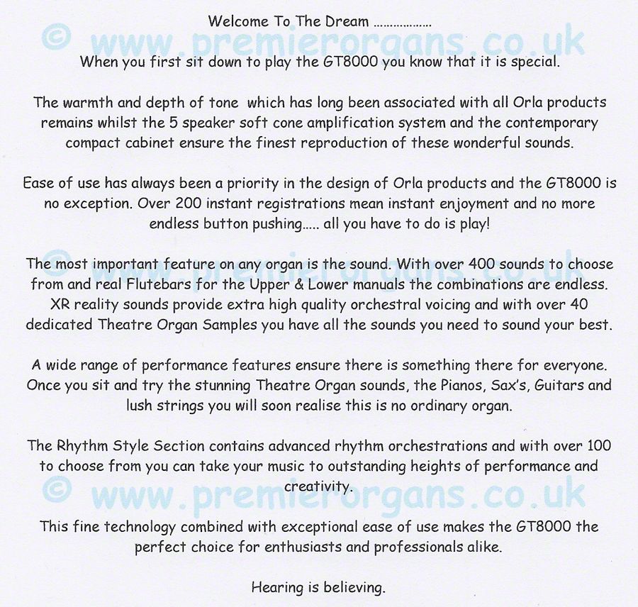 GT 8000 GT-8000 The GT8000 GT 8000LX GT 8000 LX GT-8000LX warmth depth of tone associated with Orla products remains whilst the 5 speaker soft cone amplification system Ease of use has always been a priority in the design of Orla products and the GT8000 is no exception. Over 200 instant registrations real Flutebars XR reality sounds provide extra high quality orchestral voicing and with over 40 dedicated Theatre Organ Samples