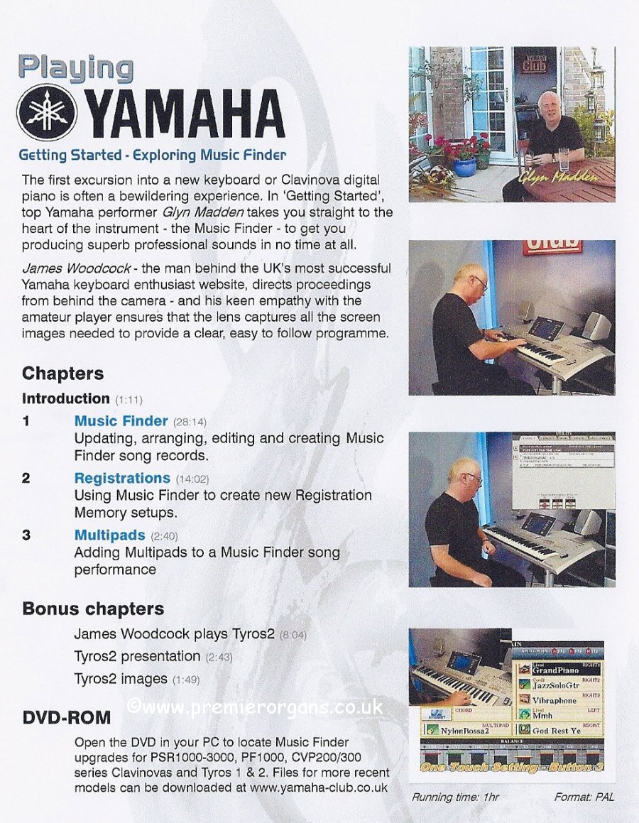 Playing Yamaha getting started exploring music finder. Yamaha Club workshop DVD presented by Glyn Madden. Tyros 1, Tyros 2, Tyros 3, Tyros 4, CVP200 - 500 series Clavinovas, PSR-S700, PSR-S900, PSR-S710, PSR-S910, PSR1000 - 3000 series keyboards
