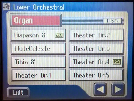 Onscreen Panel Settings and Registration: You can display current voice, reverb, and other panel settings onscreen, and adjust them easily at the touch of a finger. Settings can be saved with the eight registration buttons conveniently located between the upper and lower manuals. Just press a button to instantly change settings or voices.