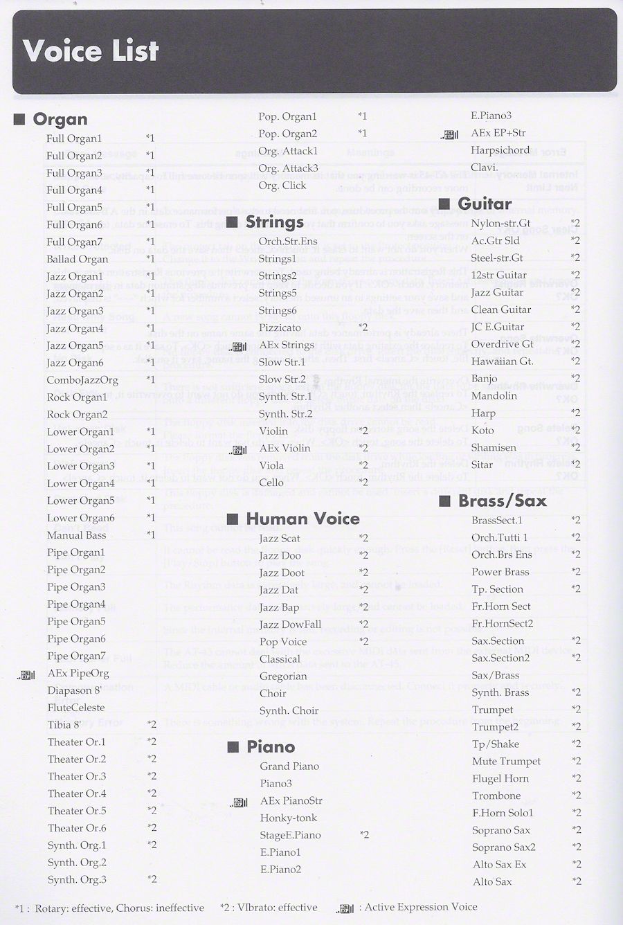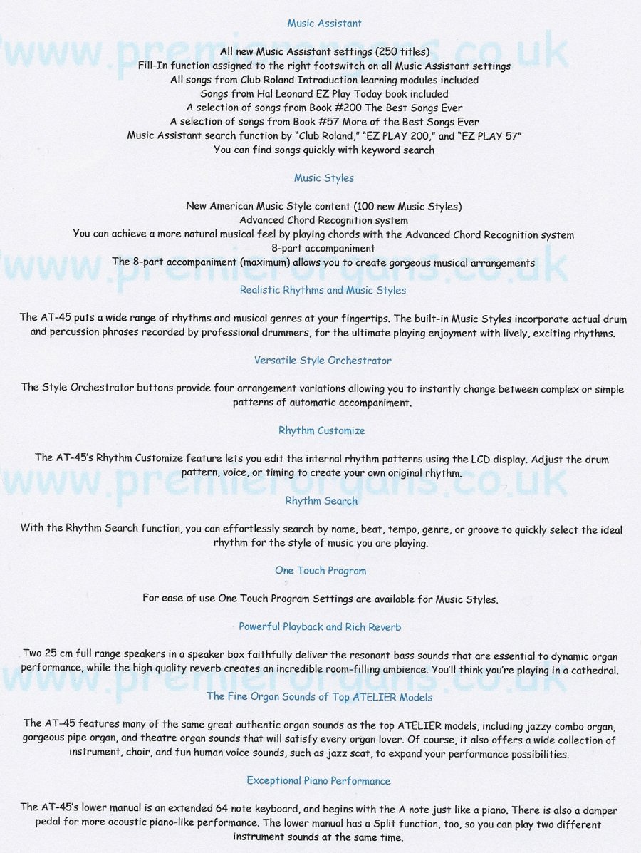 AT-45: Atelier Organ. For players who know how truly enjoyable an organ can be! Music Assistant. All new Music Assistant settings (250 titles). Fill-In function assigned to the right footswitch on all Music Assistant settings. All songs from Club Roland Introduction learning modules included. Songs from Hal Leonard EZ Play Today book included. A selection of songs from Book #200 The Best Songs Ever. A selection of songs from Book #57 More of the Best Songs Ever. Music Assistant search function by Club Roland, EZ PLAY 200, and EZ PLAY 57. You can find songs quickly with keyword search