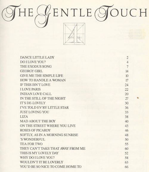 Dance Little Lady - Do I Love You - The Exodus Song - Georgy Girl - Give Me The Simple Life - How To Handle A Woman - If This Isn't Love - I Love Paris - Indian Love Call - In The Still Of The Night - It's Delovely - I've Told Every Little Star - Just Loving You - Liza - Mad About The Boy - On The Street Where You Live - Roses Of Picardy - Softly As In A Morning Sunrise - 'S Wonderful - Tea For Two - They Can't Take That Away From Me - This Is My Lovely Day - Why Do I love You - Wouldn't It Be Loverly - You's Be So Nice To Come Home To