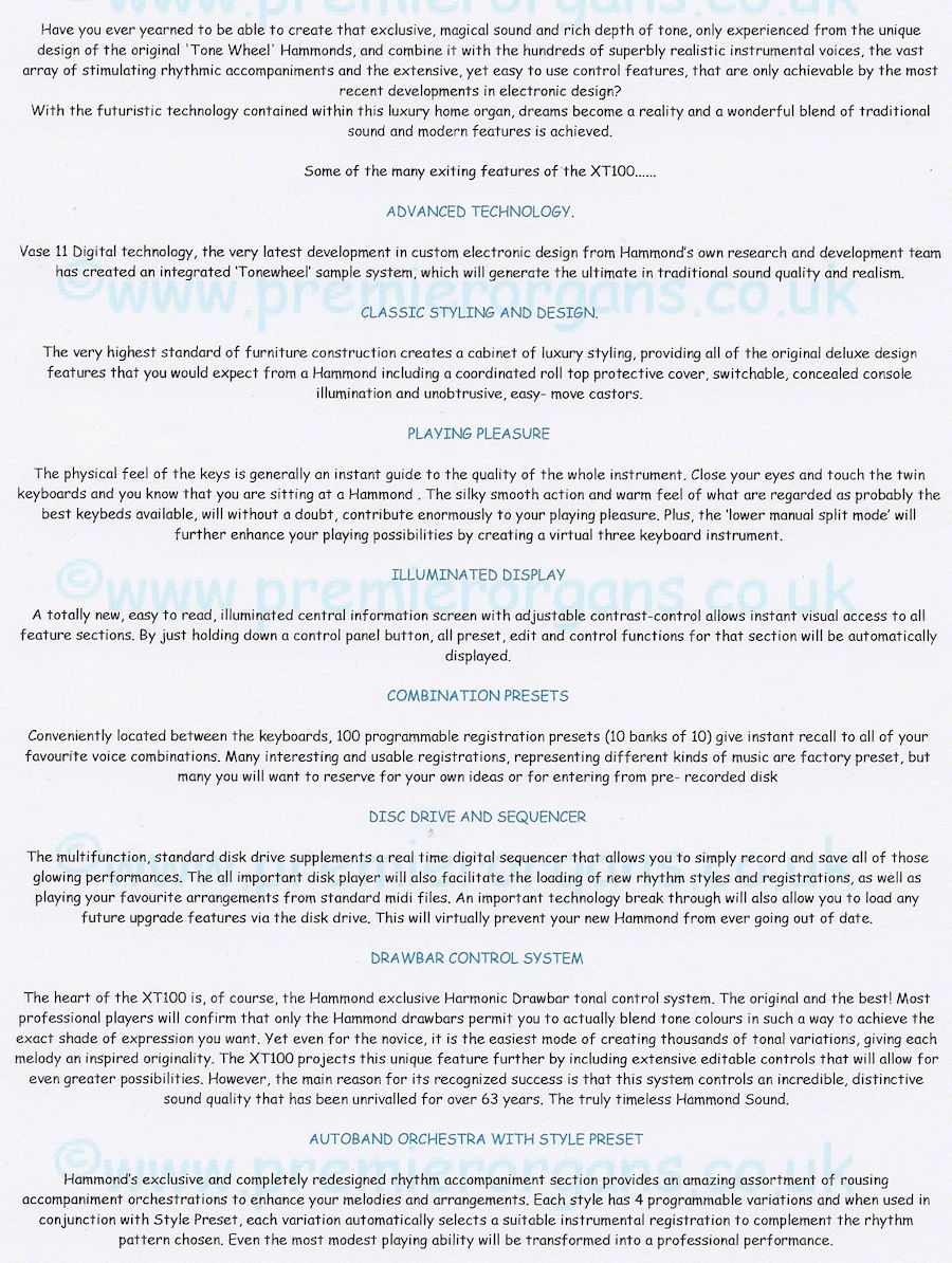 Have you ever yearned to be able to create that exclusive, magical sound and rich depth of tone, only experienced from the unique design of the original 'Tone Wheel' Hammonds, and combine it with the hundreds of superbly realistic instrumental voices, the vast array of stimulating rhythmic accompaniments and the extensive, yet easy to use control features, that are only achievable by the most recent developments in electronic design? Hammond XT-100 XT 100 XT100. Drawbar organ. Hammond sound.