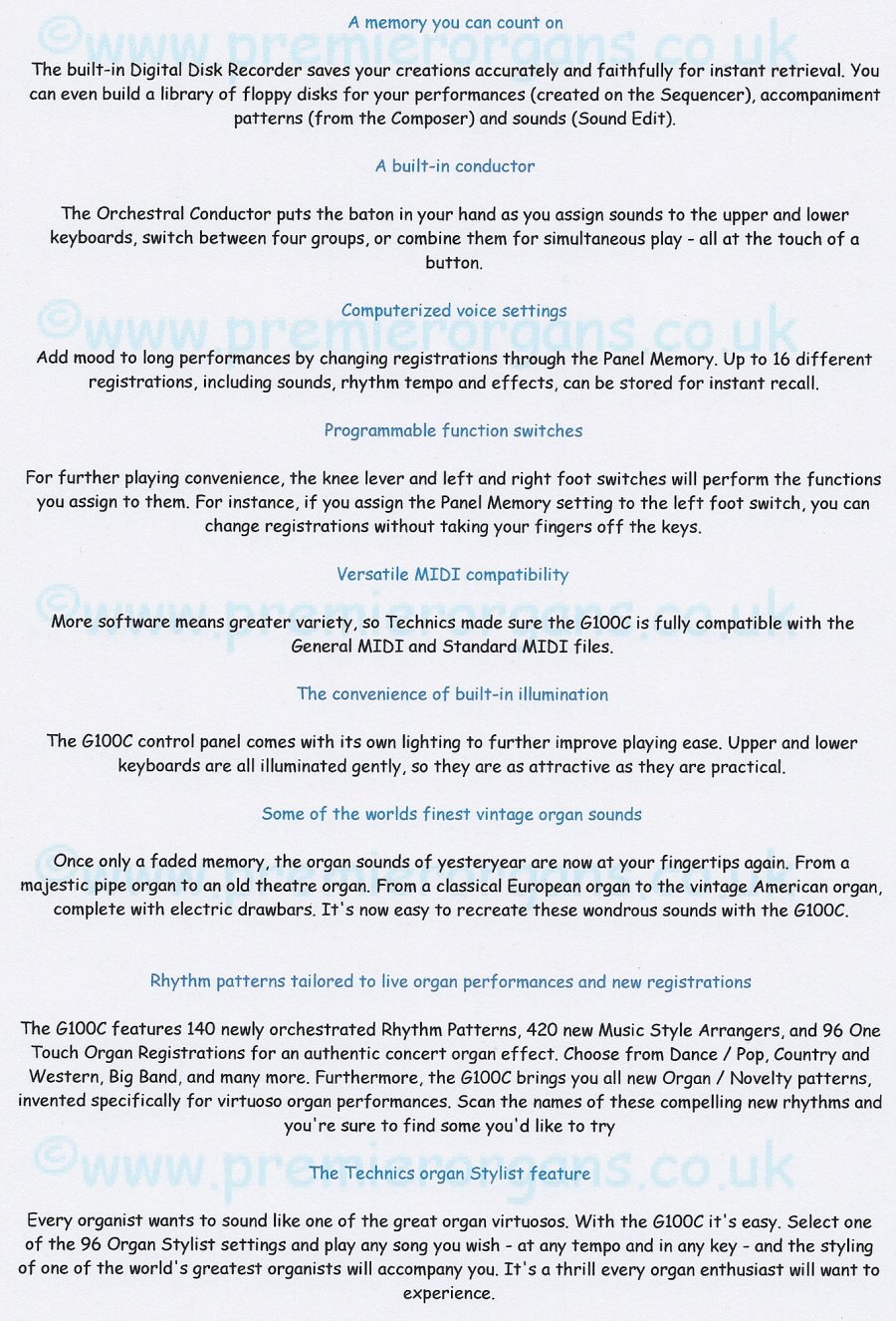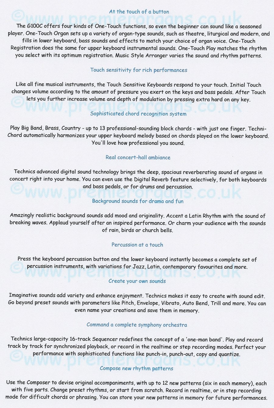 The G100C features a new sound technology breakthrough created expressly for the music you love. Faithfully reproduced vintage organ sounds and powerful bass tones let you play your favourite music the way it was meant to sound. An elegantly styled cabinet finished in rich cherry veneers imparts a feeling of warmth and nostalgia, as you explore the G100's wealth of authentic rhythms, registrations and styles. An impressive, top of range organ that has some of the worlds finest vintage organ sounds. Once only a faded memory, the organ sounds of yesteryear are now at your fingertips again. From a big pipe organ to an old theatre organ. From a classical European organ to the vintage American organ, complete with electric drawbars. It's now easy to recreate these wondrous sounds with the G100C.
